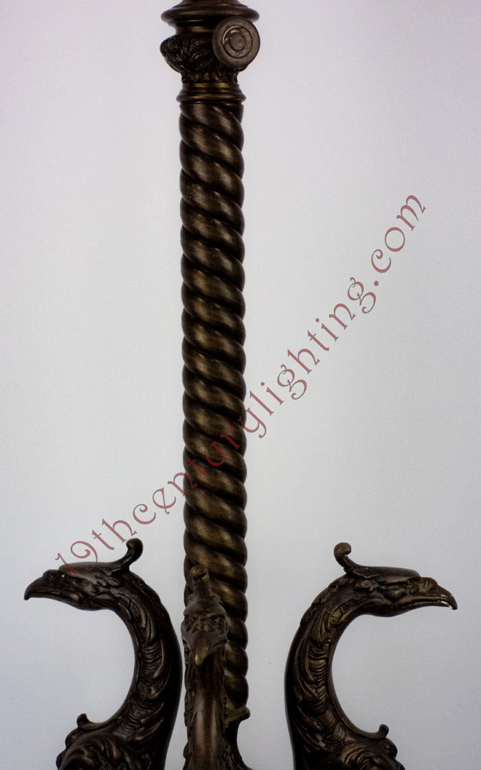 Exceedingly rare and unusual 3-Heron floor lamp with heavily embossed font case. This is an exceptionally rare floor lamp, we find them all the time with embossed feet but never with such an elaborate design with the heron foot.