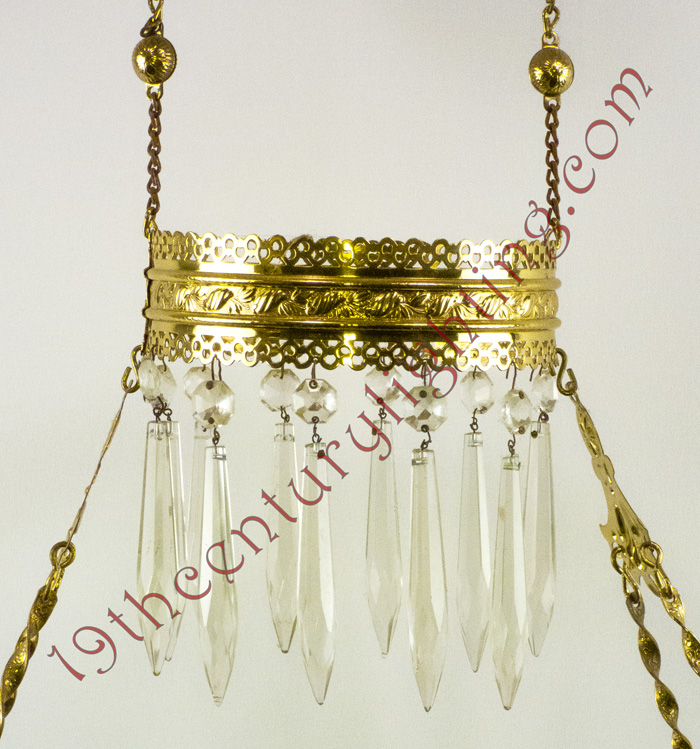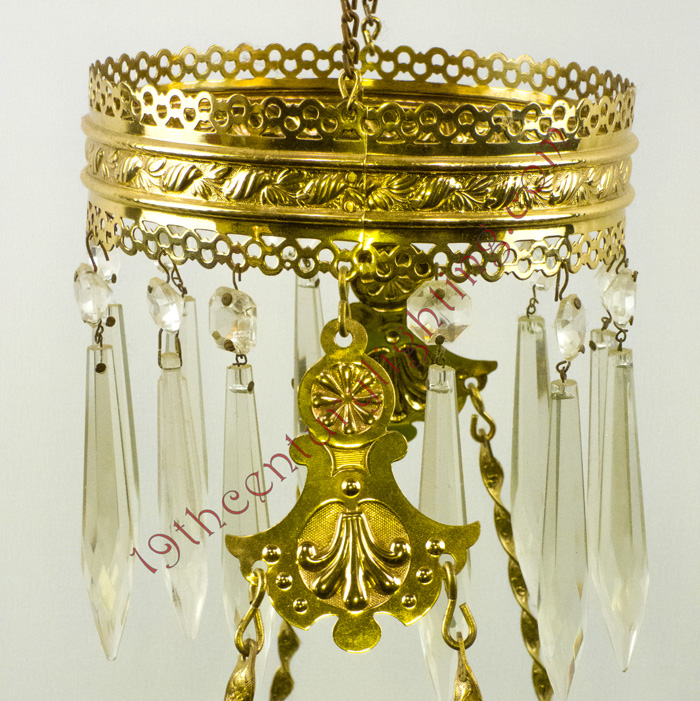 Our hanging lamps are typically photographed without any prisms, as to not obscure any parts of the lamp being shown. All hanging lamps include a full set of old standard prisms & chimney, otherwise they include the prisms shown. Upgraded prisms may be requested upon availability. The shades shown on the lamp is our best determination for the aesthetic appeal of the lamp, we have inventory on many different shades.