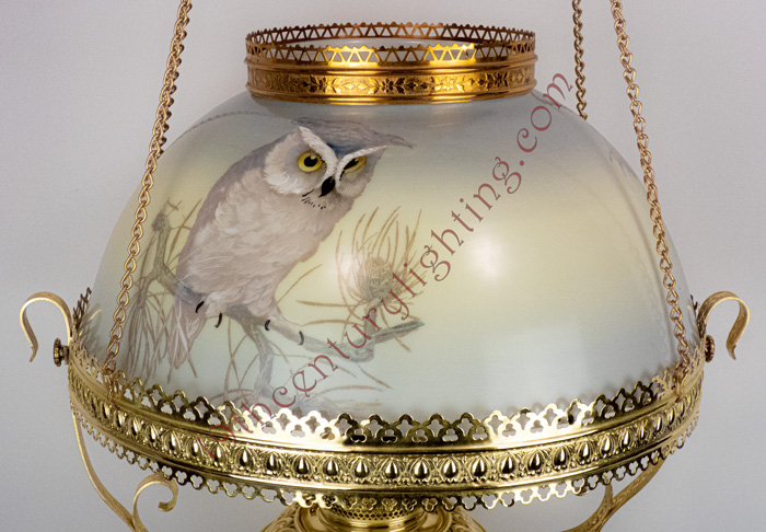 Extremely rare “Great Horned Owls” Hanging Lamp by Pittsburgh. The Owl lamps produced by Pittsburgh came in both two table lamp versions, an open and ball shade variant, and in the exceptionally rare hanging lamp version. The shade features a pair of Owls on the front and a singular Owl on the reverse, while the font glass features a singular Owl on the front and branches on the reverse.