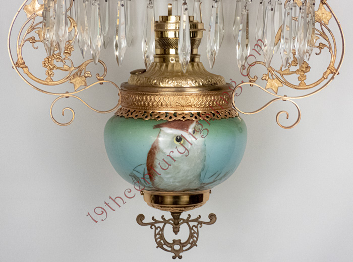 This is exceptionally rare variant of this frame for the owls style hanging lamp. This version has not only a cast brass harp but the harp only attaches to the font from the top, letting the font float without having support from the bottom. This version also has upgraded standoffs on the shade band with twistys connecting it to the spreaders.