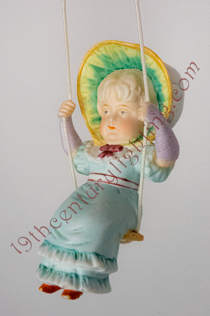 "Swingers" were produced in Europe, mostly in Germany, for the Cottage Industry. They are made of Porcelain and hand-painted. Swingers are usually portrayed as one or two children on a swing and commonly referred to as "Dutch Children". They hang from the bottom of a hanging lamp both as a decorative accessory and as a pull to lower the hanging lamp.