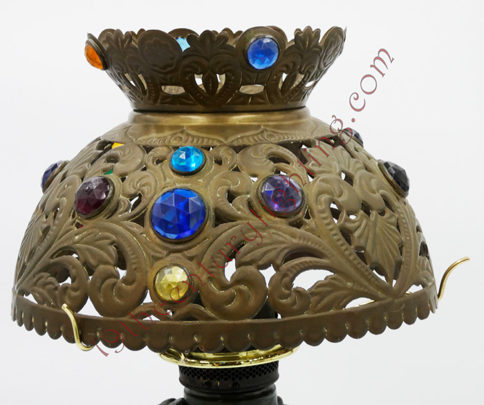 All of our banquet lamps are shown without shades, except for the extremely rare circumstances that the lamp originally came with shade and it has been found. We also occasionally will show shades that "match" the size and style of the lamp being shown and are included with the lamp. We have a varying inventory of fabric shades, umbrella shades and occasionally ball shades to complete the lamps. Enquire for our current inventory of available shades.