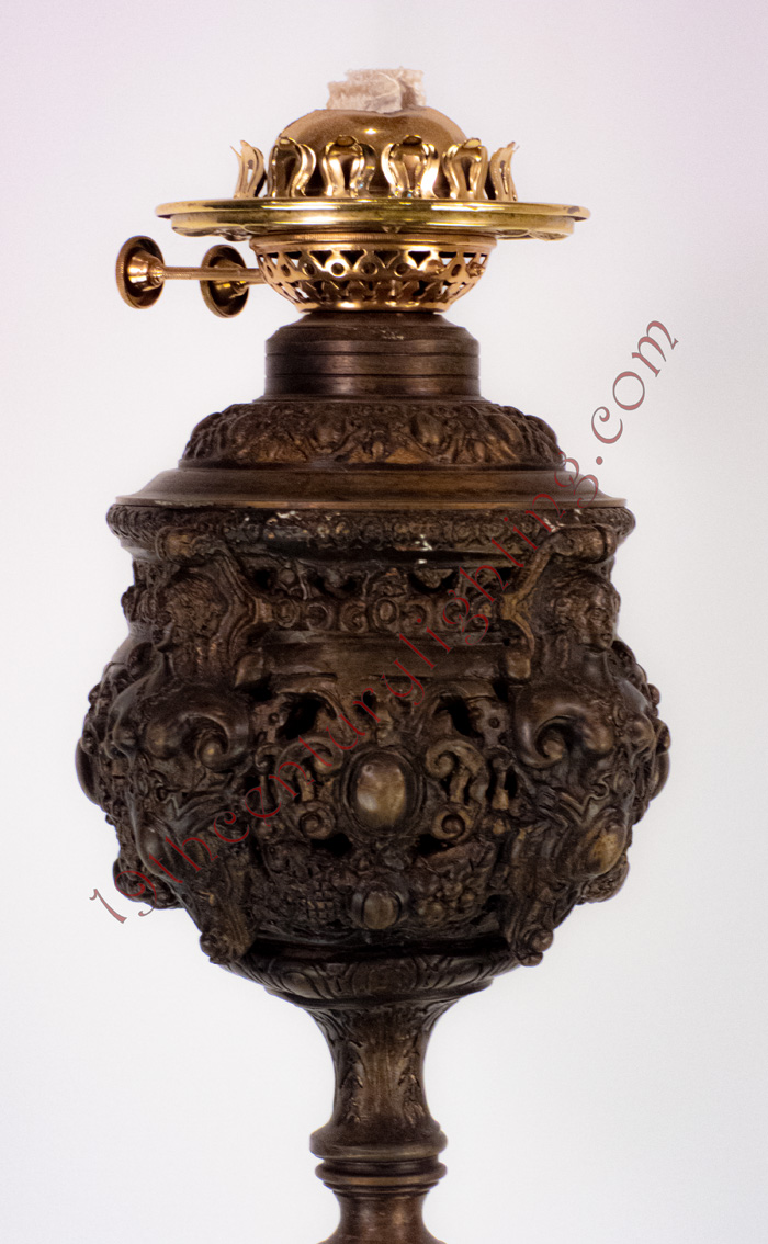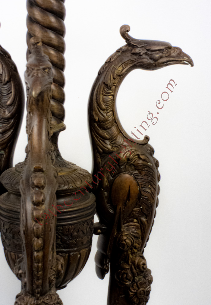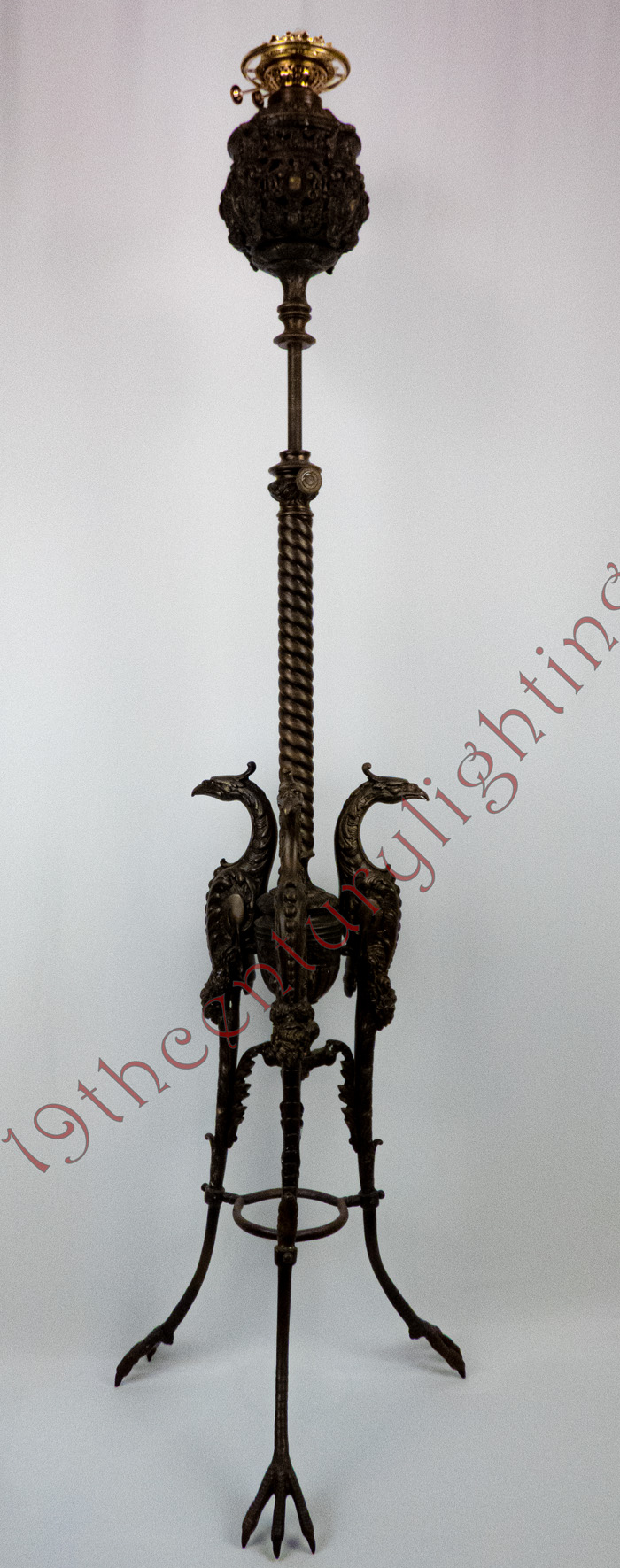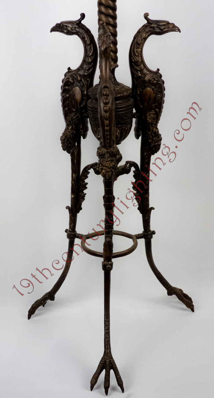 Exceedingly rare and unusual 3-Heron floor lamp with heavily embossed font case. This is an exceptionally rare floor lamp, we find them all the time with embossed feet but never with such an elaborate design with the heron foot.