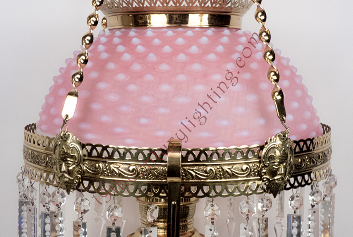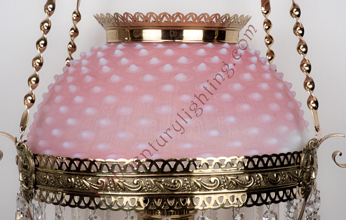 Extremely Rare Edward Miller Matching Hobnail Peach-blow Shade and Font Hanging Lamp with Spear Point Prisms. Accented with oversized twistys, cast brass shade ring attachment faces and Egyptian Pharaoh spreaders.