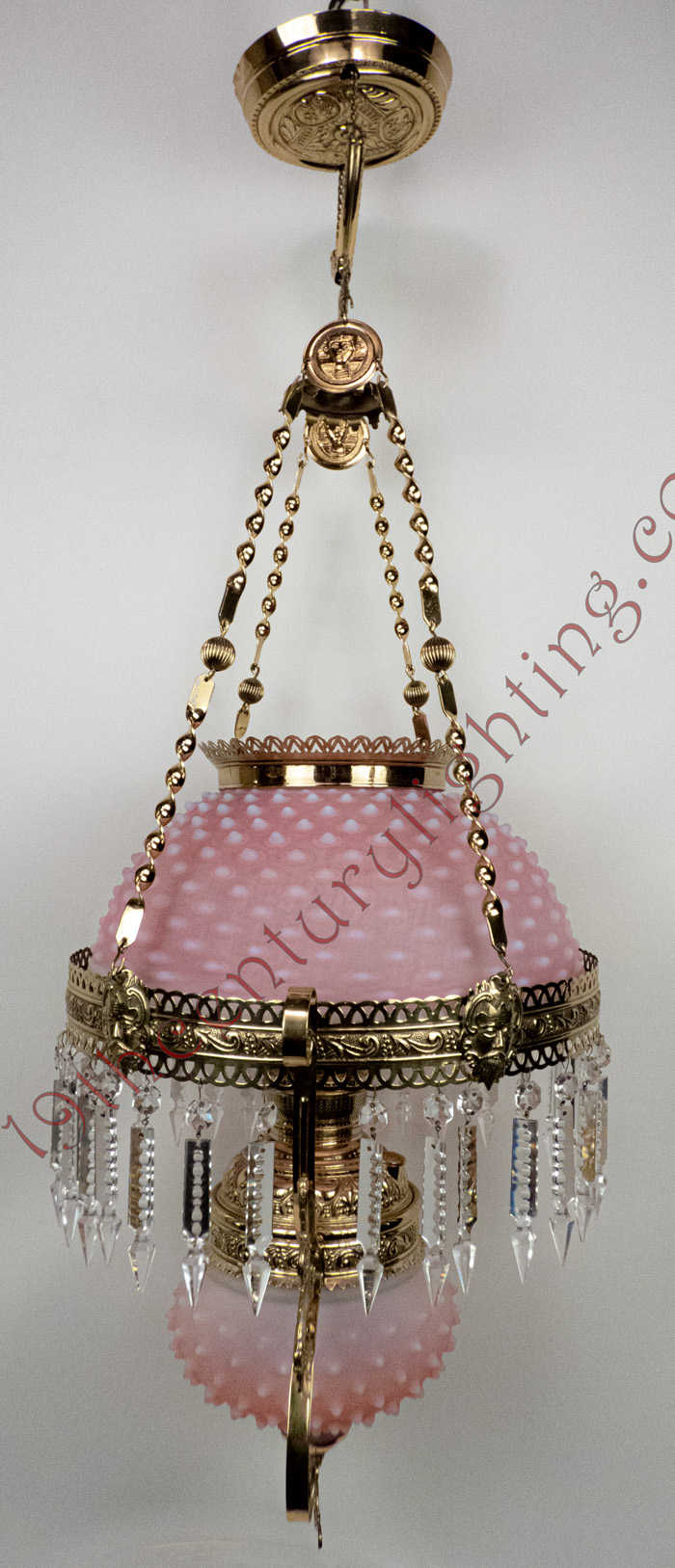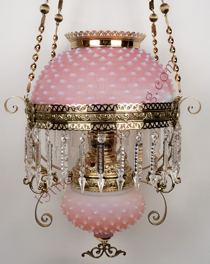 Our hanging lamps are typically photographed without any prisms, as to not obscure any parts of the lamp being shown. All hanging lamps include a full set of old standard prisms & chimney, otherwise they include the prisms shown. Upgraded prisms may be requested upon availability. The shades shown on the lamp is our best determination for the aesthetic appeal of the lamp, we have inventory on many different shades.