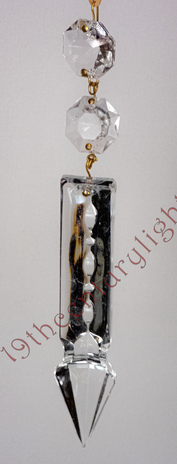 Antique spear point prisms are exceptionally rare and come in several different styles. They may have multiple or singular Bobisch (upper crystals) and may or may not have cuts in the spear. They are considered "superior" to standard prisms in the way they refract light and a much more vibrant gemming effect. All old prisms were produced by hand almost exclusively in Czechoslovakia. We only sell Spear Point Prisms as an upgrade option for hanging lamps. Contact us for availability.