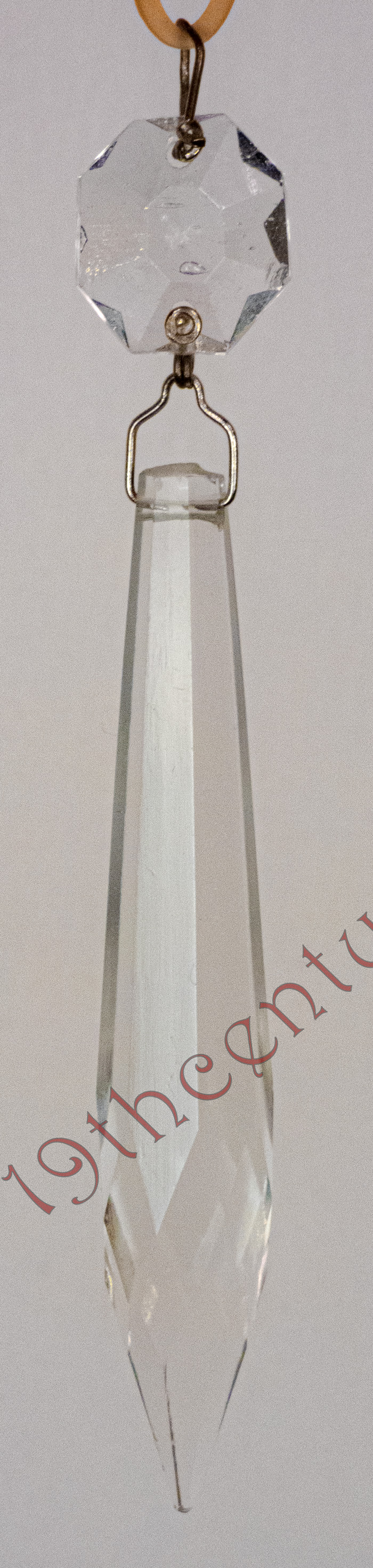 Asparagus point prism is the standard style of prism that is most common for hanging lamps and are 4 inches tall. There is little difference between the new and old prisms as they are produced in almost the exact same way. To be able to tell the difference between old and new prisms is that; new prisms are connected by a "Harp" and old prisms use a singular piece of wire. All old and new prisms are produced by hand exclusively in Czechoslovakia/Czech Republic. Prisms are sold in sets of 32.