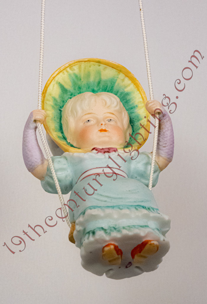 "Swingers" were produced in Europe, mostly in Germany, for the Cottage Industry. They are made of Porcelain and hand-painted. Swingers are usually portrayed as one or two children on a swing and commonly referred to as "Dutch Children". They hang from the bottom of a hanging lamp both as a decorative accessory and as a pull to lower the hanging lamp.