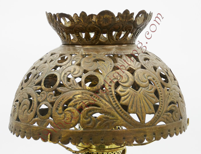 All of our banquet lamps are shown without shades, except for the extremely rare circumstances that the lamp originally came with shade and it has been found. We also occasionally will show shades that "match" the size and style of the lamp being shown and are included with the lamp. We have a varying inventory of fabric shades, umbrella shades and occasionally ball shades to complete the lamps. Enquire for our current inventory of available shades.